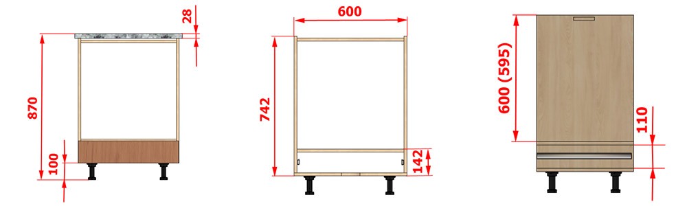 Итак (смотри статью об эскизе кухни), общая высота этого модуля равна 870мм, толщина столешницы – 28мм, толщина ДСП – 16мм.